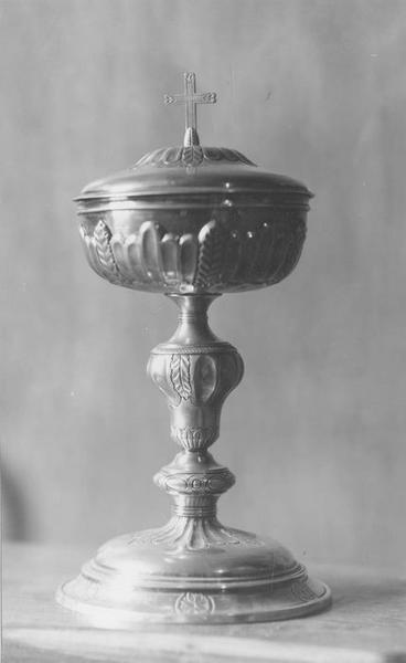 Base ornée de rosaces sur le pourtour et de cotes à la partie supérieure. Noeud allongé et renflé du haut, décoré en alternance d'encoches et de feuilles de culots. Fausse coupe à cotes et feuilles. Couvercle à charnière de même ornementation, avec croix au sommet.