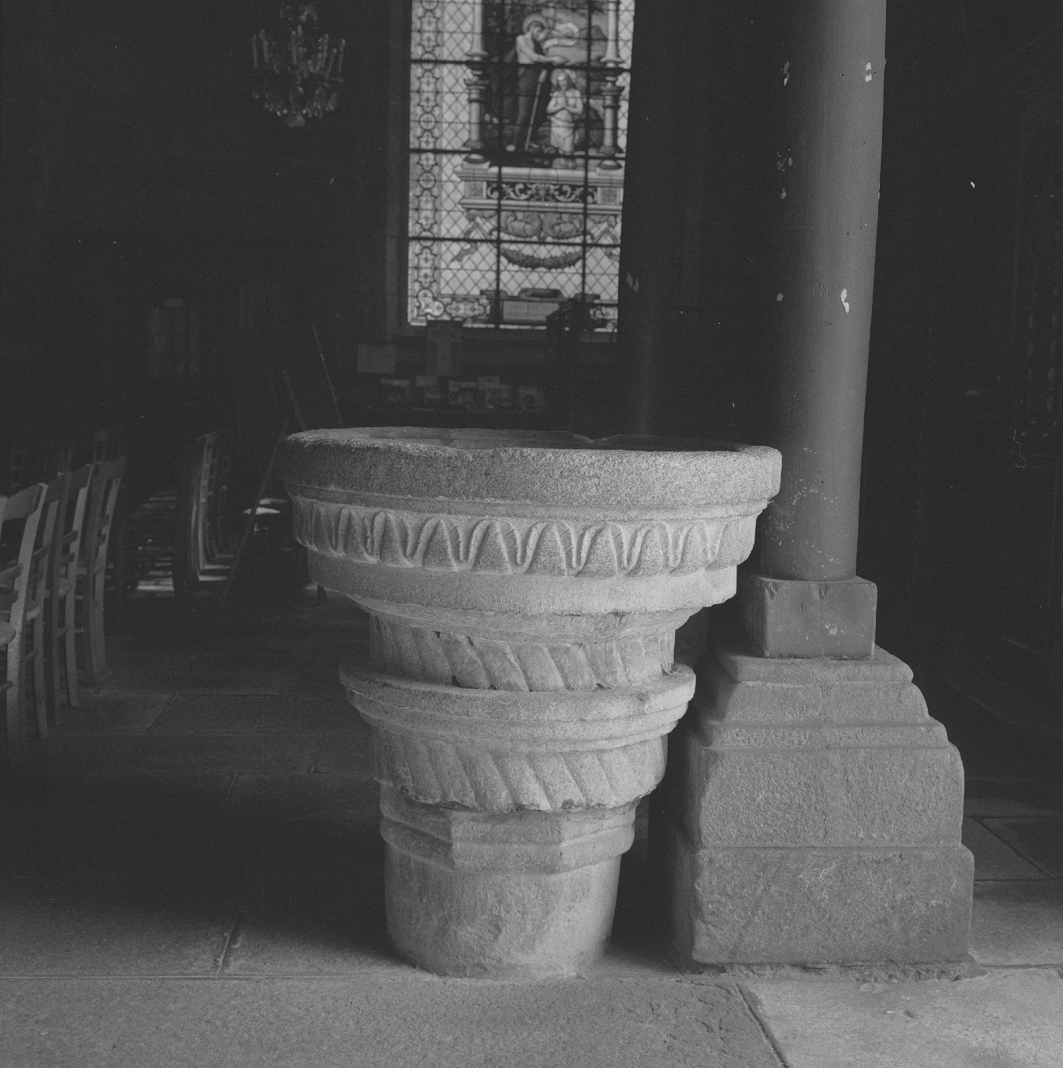 Le bassin est décoré d'une frise de lambrequins et d'un faisceau de godrons elliptiques ceinturé d'une grosse moulure. Le socle est une petite colonne cylindrique surmontée de deux moulures octogonales.
