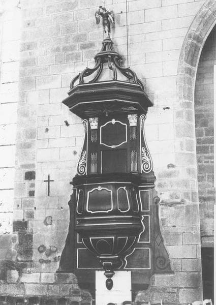 Chaire accrochée au mur, sans escalier apparent. Cuve galbée présentant une série de petits panneaux. Le dossier comprend deux pilastres cannelés à chapiteaux corinthiens, un panneau central et deux ailerons. L'abat-voix est couronné d'un amortissement avec ange.