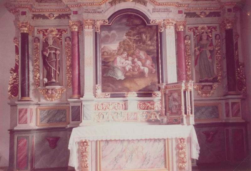 Des pilastres cannelés entourent le tableau central tandis que les niches latérales sont encadrées par des colonnes lisses.