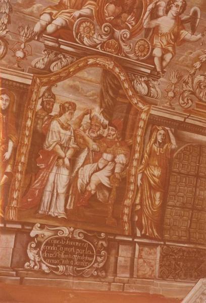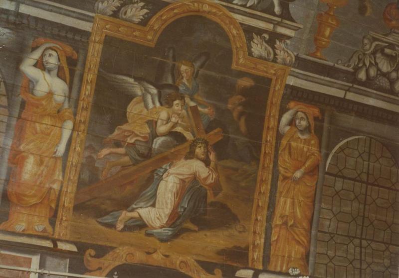 lambris de revêtement : Comment les vieillards accusèrent sainte Suzanne à son mari Joachim du miracle de l'avoir surprise en adultère, Comment sainte Suzanne est condamnée à mort par les deux vieillards après la fausse accusation faite à son mari, scènes de la passion, l'Ange Gabriel, la Passion, la Résurrection, l'Ascension