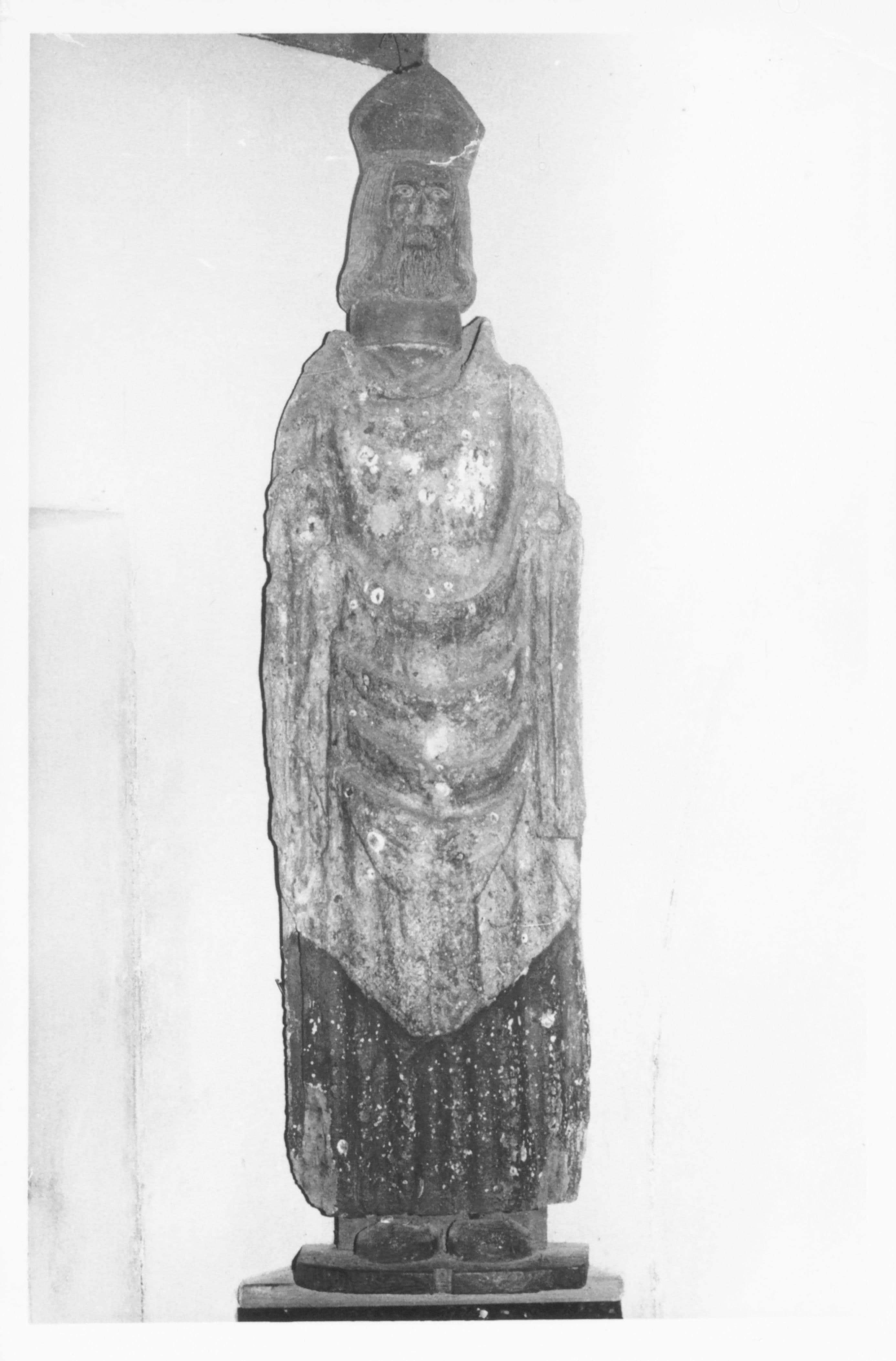 Le saint est représenté debout, vêtu de la mitre, de l'aube et de la chasuble.