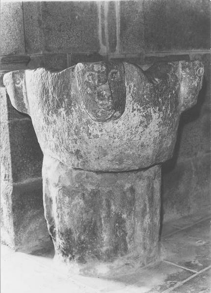 Bénitier décoré de quatre mascarons. La coupe et montée sur un tambour de colonne antique cannelée. Les bords sont usés par le frottement d'outils que l'on affûtait après imprégnation d'eau bénite.