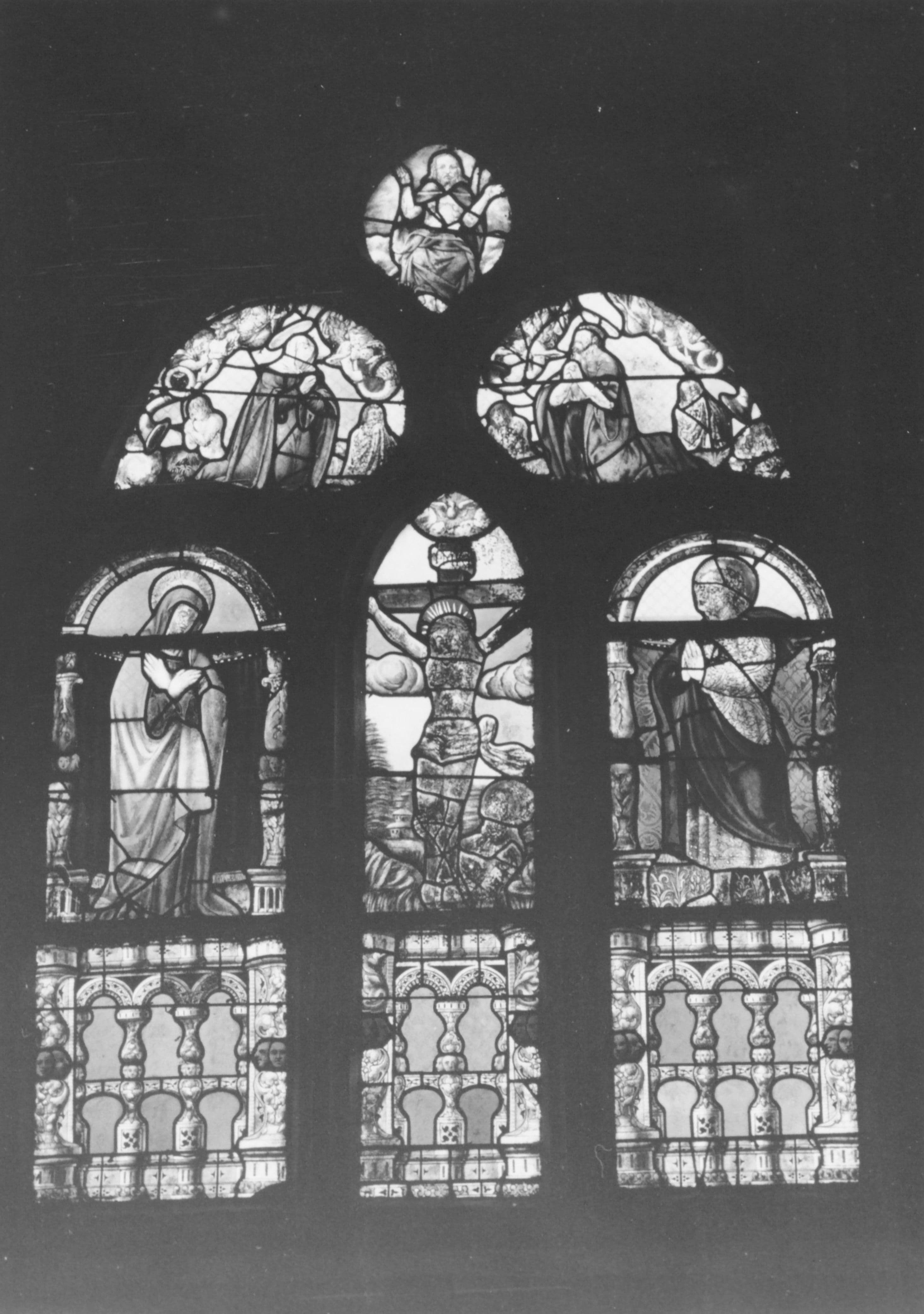 POP | Plateforme ouverte du patrimoine2 verrières : le Christ en croix, saint Jean-Baptiste baptisant le Christ, saint Jean-Baptiste emmené prisonnier par ordre d'Hérode, saint Jean-Baptiste sermonne Hérodiade et sont beau-frère tous deux richement vêtus, la Décollation de saint Jean-Baptiste