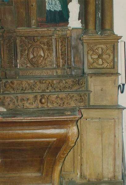 Le devant d'autel est sculpté d'un médaillon historié. Le tabernacle élevé sur deux degrés est encadré de panneaux offrant des profils sculptés, une abondante décoration de colonnettes, de chutes de fleurs, de rinceaux et de têtes d'anges. Le retable à fronton curviligne possède de chaque côté des colonnes jumelées.