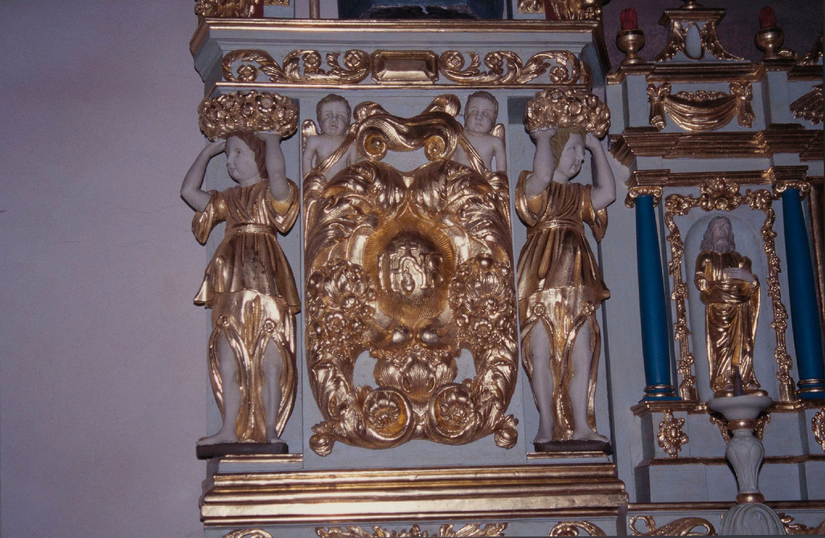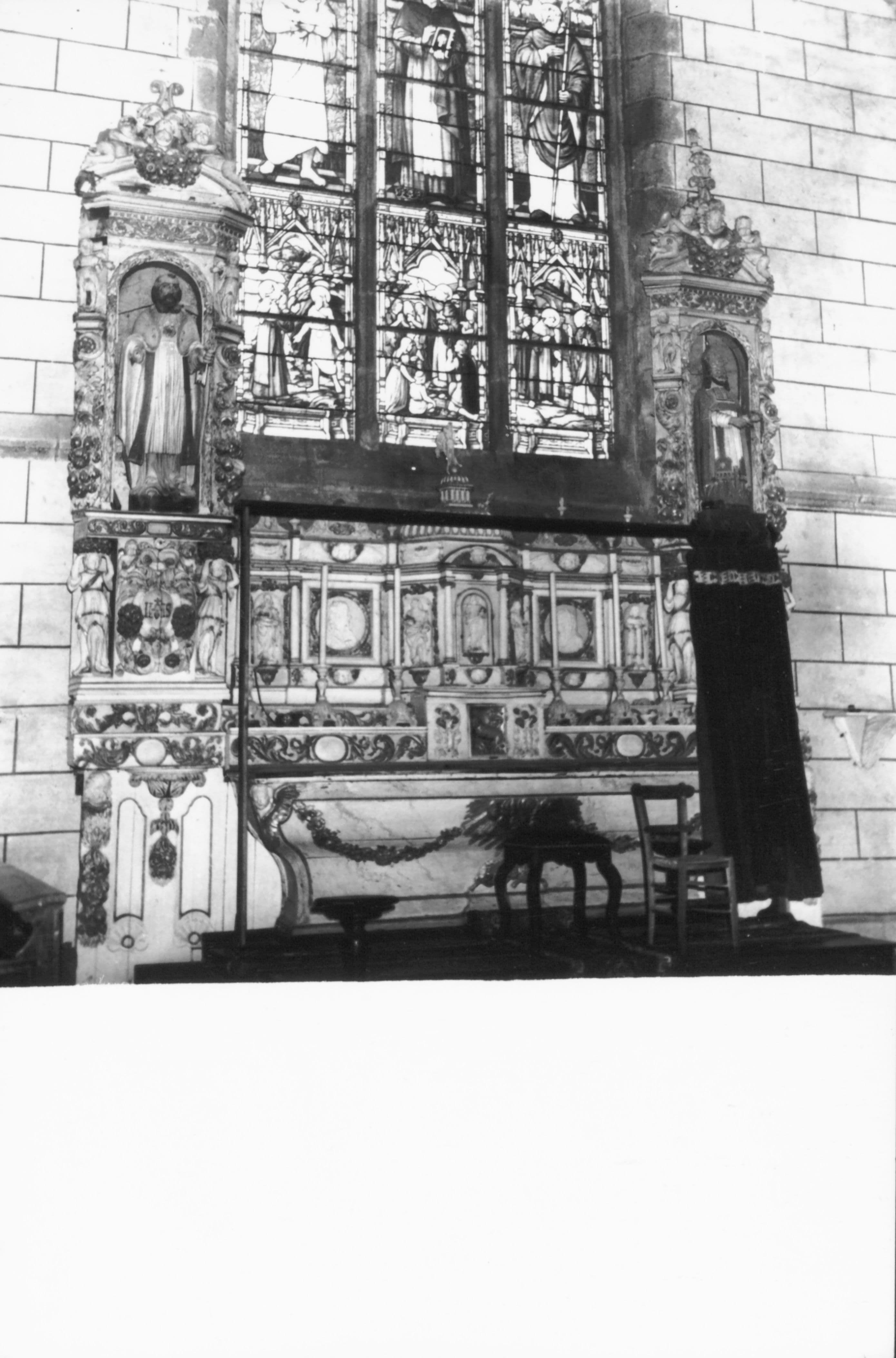 Maître-autel orné de figures en relief et de nombreuses statuettes dans des niches blanc et or. Il s'élève en deux panneaux pareillement ouvragés de chaque côté et à mi-partie de la grande vitre du fond.