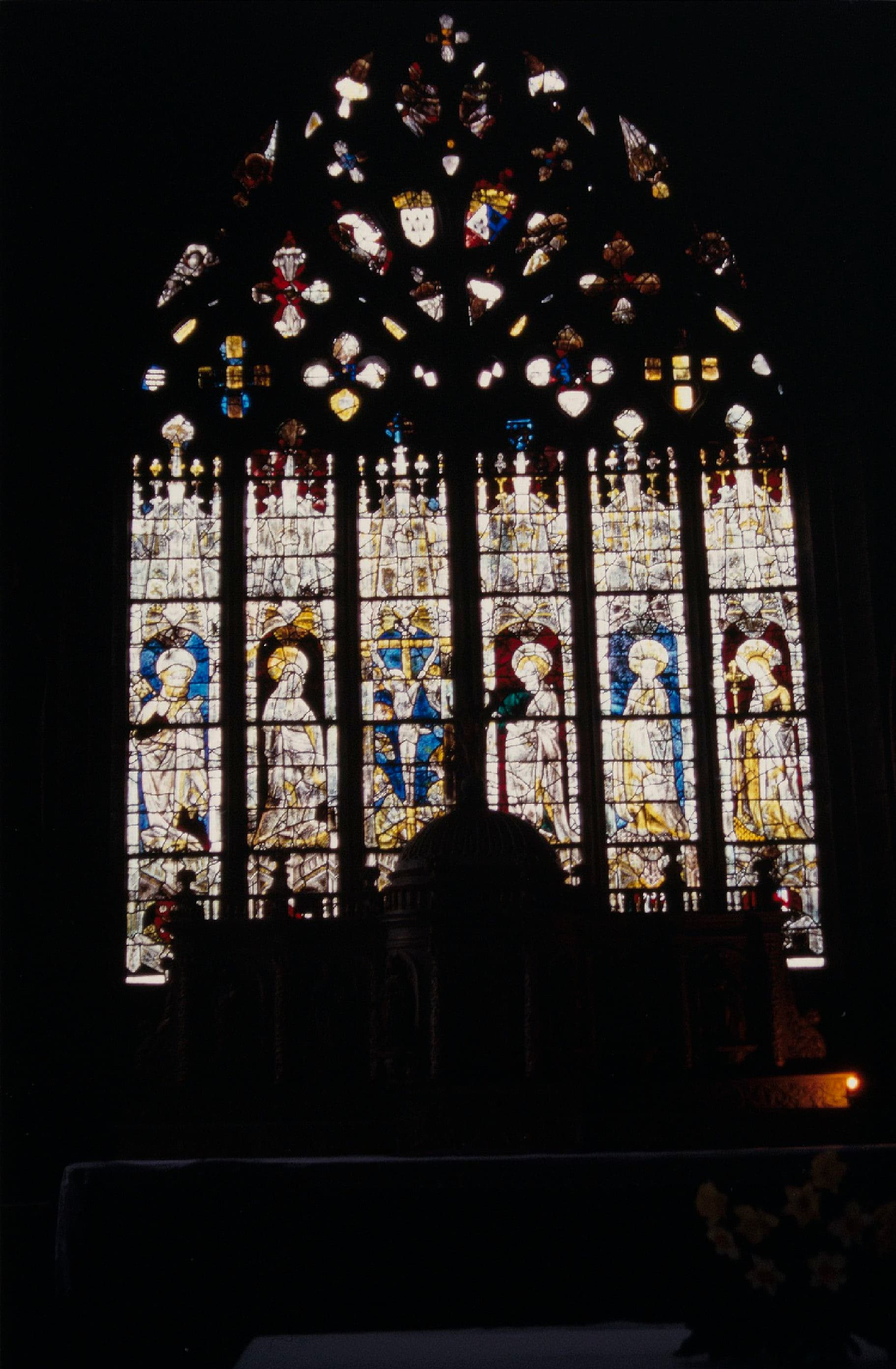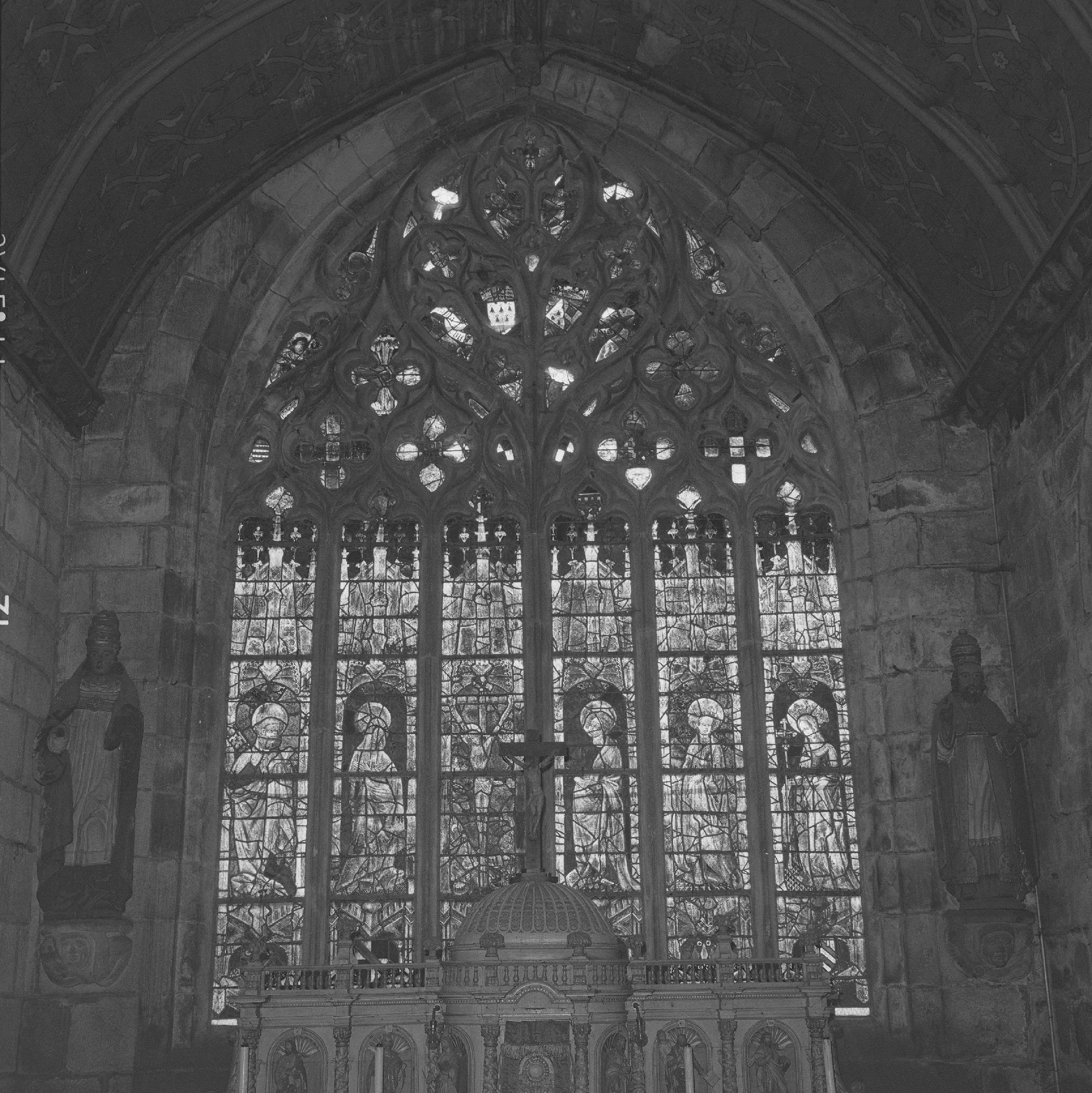 verrière : saint Pierre, Vierge (la), Christ en croix, saint Jean, sainte Catherine, sainte Hélène