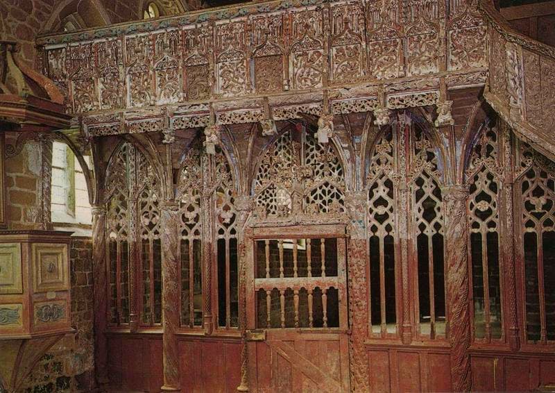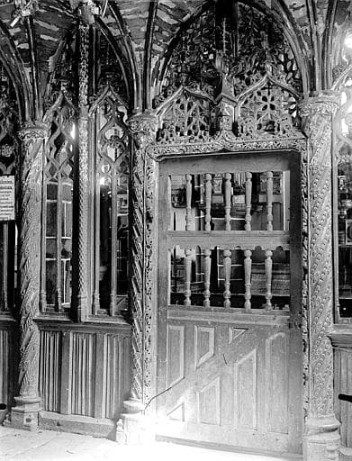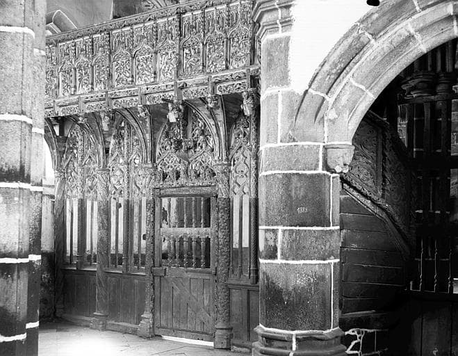 Jubé composé d'une clôture ajourée en cinq travées, supportant par encorbellement, une tribune. Un petit escalier à vis, avec sa porte primitive, donne accès à cette tribune.