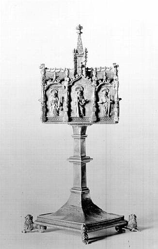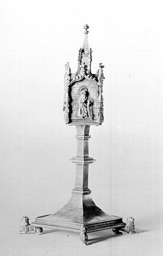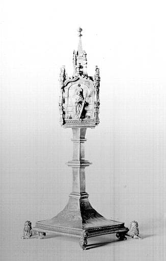 Reliquaire pédiculé. Petite caisse en forme d'église à une seule nef et à chevet carré, ornée sur chaque face de trois arcs ogives portés sur des colonnes en candélabre, toit à crête et clocher central. Le reliquaire est posé diagonalement sur une tige rectangulaire, interrompue par une moulure, sortant d'un pied en doucine, porté sur quatre lions.