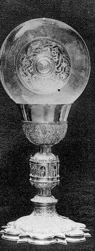 Calice à pied à six lobes séparés par six joints.Noeud-bulbe percé de niches renfermant des statuettes. Coupe ornée de palmettes alternant avec des motifs végétaux. Sur la patène, des entrelacs et des rinceaux de feuillages entourent le médaillon central.