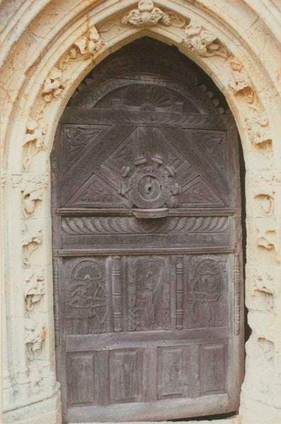 Au-dessus des quatre panneaux inférieurs, sont placés trois panneaux sculptés en bas-relief.