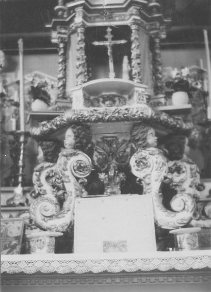 Le tabernacle est composé d'un dôme surmonté d'un lanternon sur huit colonnettes torses. Chaque colonnette est surmontée d'un pot à feu. L'autel se termine par un cul-de-lampe orné de feuillages.