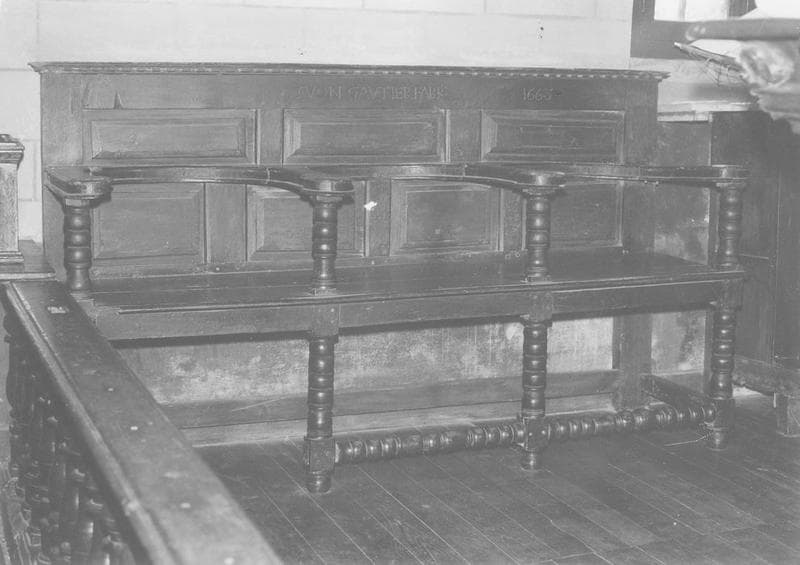 Stalles (2). Banc à trois places. Pieds et entretoises tournées. Supports d'accoudoirs tournés. dossier plat. Places séparées par des accoudoirs rattachés au dossier et découpés en demi-cercle.