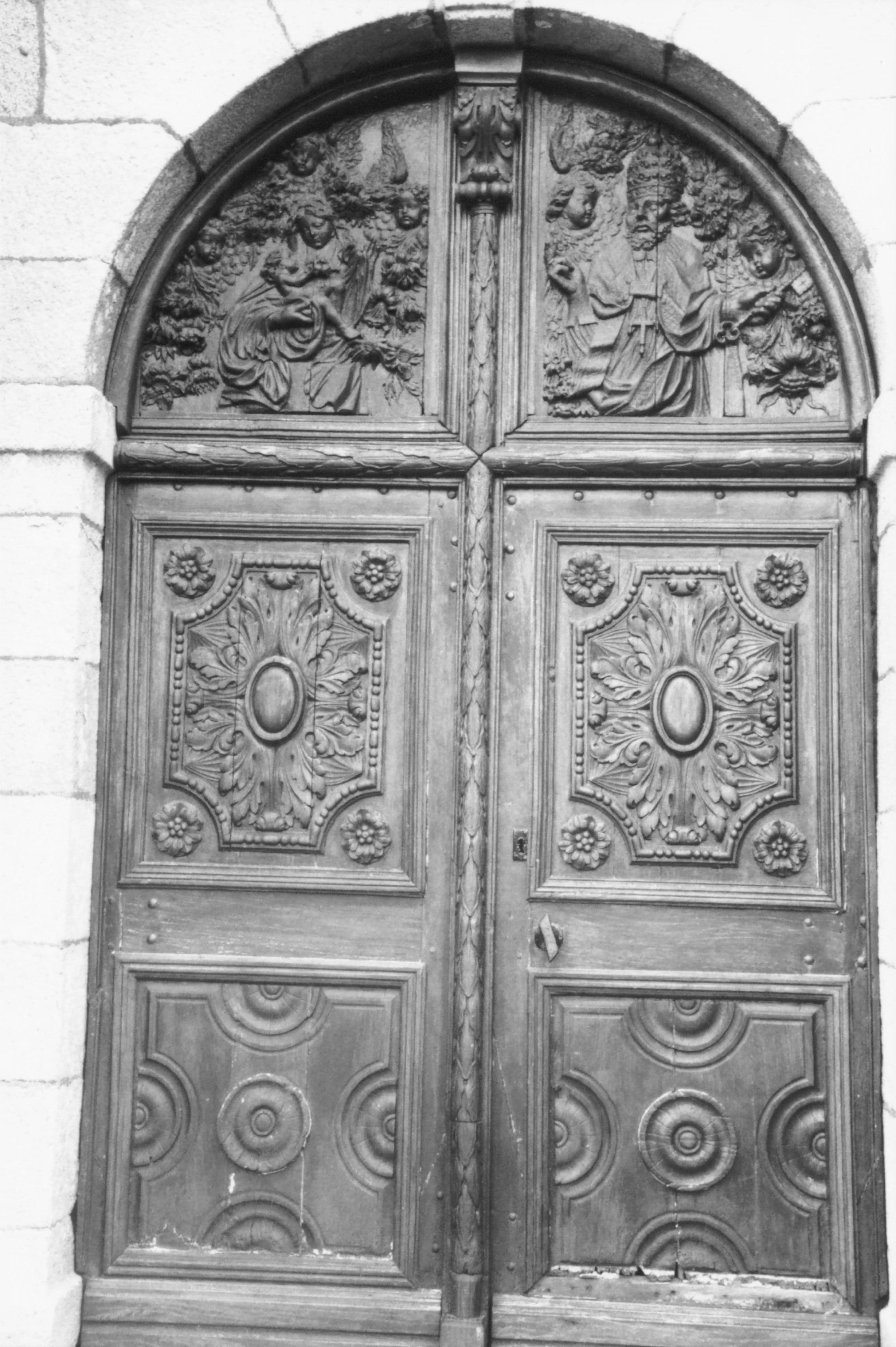 Vantaux de porte rectangulaires semblables, formés de deux panneaux : carré orné de motifs géométriques (bas), rectangulaire sculpté de motifs végétaux (haut). Tympan divisé verticalement en deux parties, sculpté en bas-relief.
