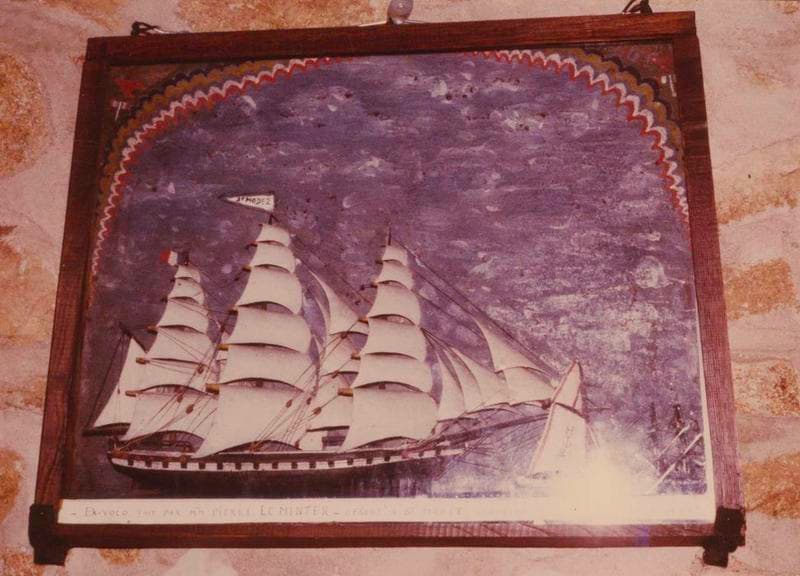 Bateau à trois mâts carrés. Demi-coque navigante sous cadre.