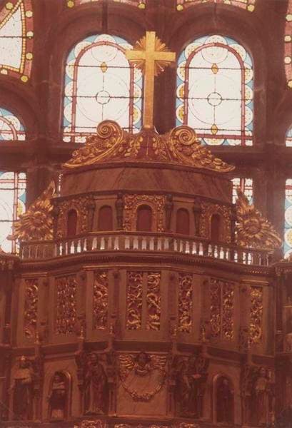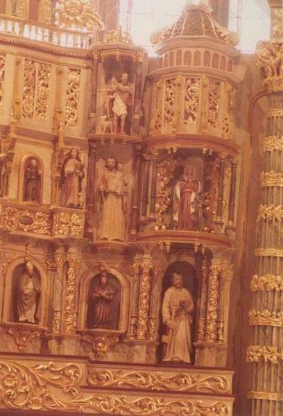 Au centre, un tabernacle polygonal surmonté d'un édicule s'élevant jusqu'au sommet du retable et surmonté d'un dôme. Les faces sont ornées de niches, de statuettes et de petits panneaux sculptés. panneaux latéraux comportant trois étages de niches à statuettes. Toutes les niches et les panneaux sont ornés de colonnettes et de motifs floraux finement sculptés. Les niches latérales sont encastrées de colonnes, surmontées d'un entablement amorti de pots à feu.
