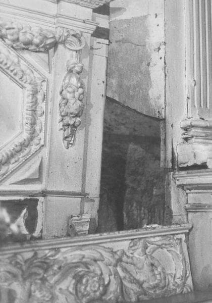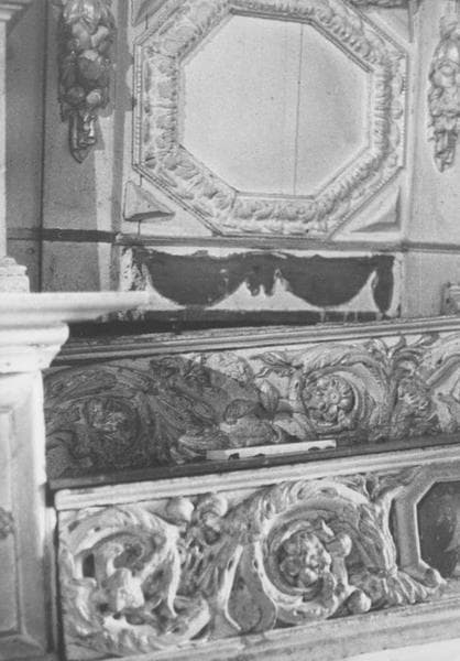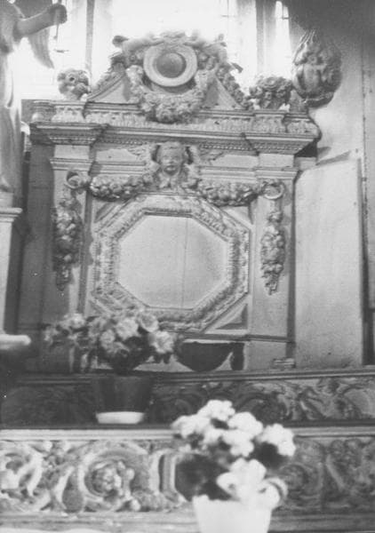 Tabernacle surmonté d'une niche encadrée de deux anges. Aux deux extrémités, des niches encadrées de colonnes surmontées d'un entablement, d'un fronton curviligne brisé avec guirlande de fleurs et amortissement d'un panier de fleurs.