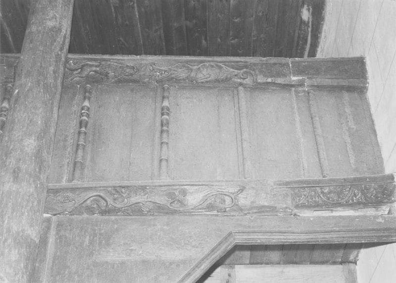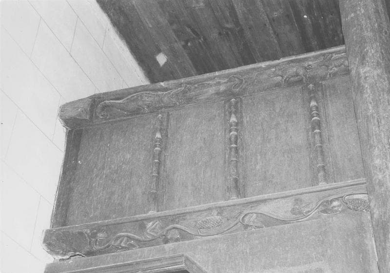 Tribune avec une balustrade composée de 14 panneaux séparés par des rinceaux.