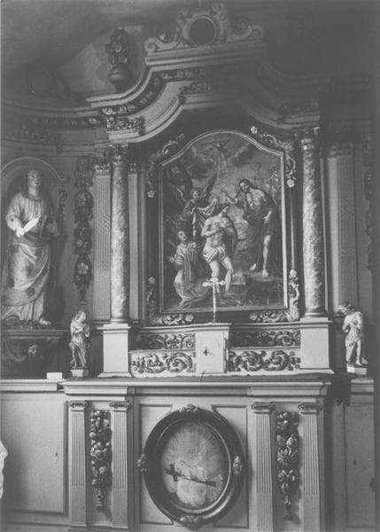Retable à trois volets couronnés de petits frontons et de vases de fleurs.