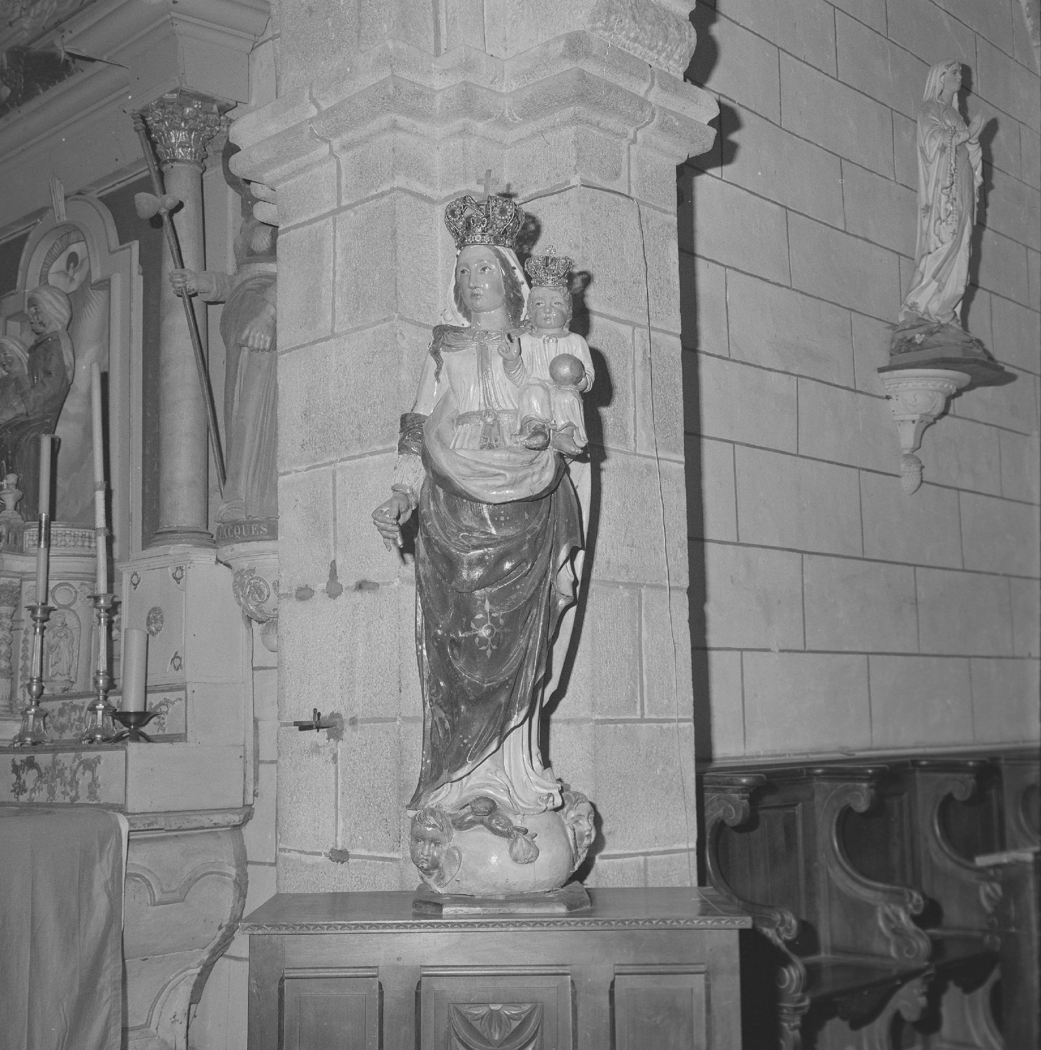 La Vierge, couronnée, est debout sur un socle de forme ovoïde, orné de deux têtes d'anges, et sur lequel on aperçoit le serpent. Elle est vêtue d'une robe au corsage ceinturé, et d'un manteau. Elle porte l'Enfant Jésus, assis et vêtu d'une tunique, sur le bras gauche. Dans la main droite, elle tient un porte-fleur. L'Enfant est également couronné. Il tient le globe dans la main gauche et bénit de la main droite.