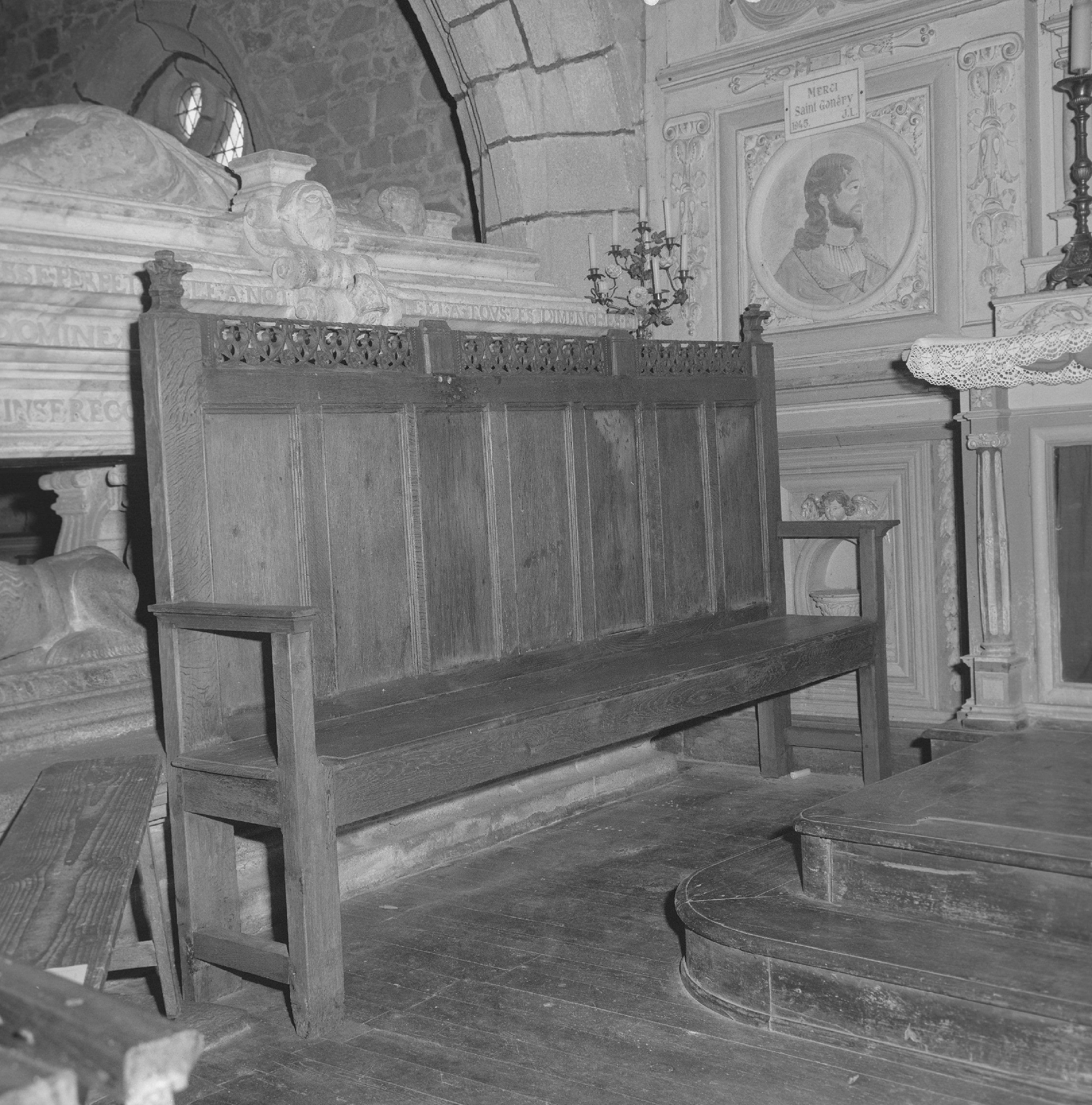 Banc à accoudoirs et haut dossier. Ce dernier est divisé en sept panneaux et présente à ses extrémités supérieures deux fleurons, entre lesquels court une frise ajourée gothique à fleurs et feuillages.