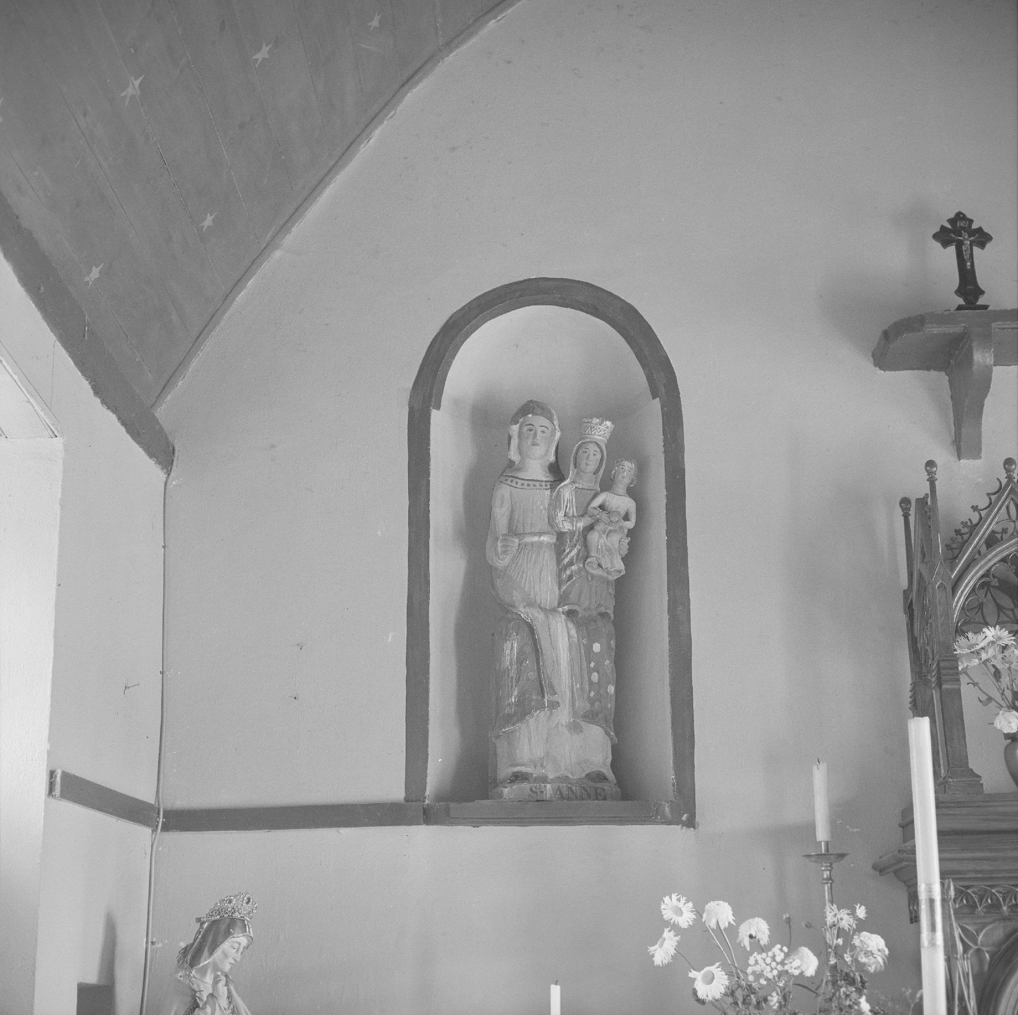 Sainte Anne assise, présentant un corps démesurément long, porte la Vierge sur son bras gauche. Cette dernière, couronnée, porte elle-même sur son bras gauche l'Enfant Jésus, vêtu, tenant le globe des deux mains.