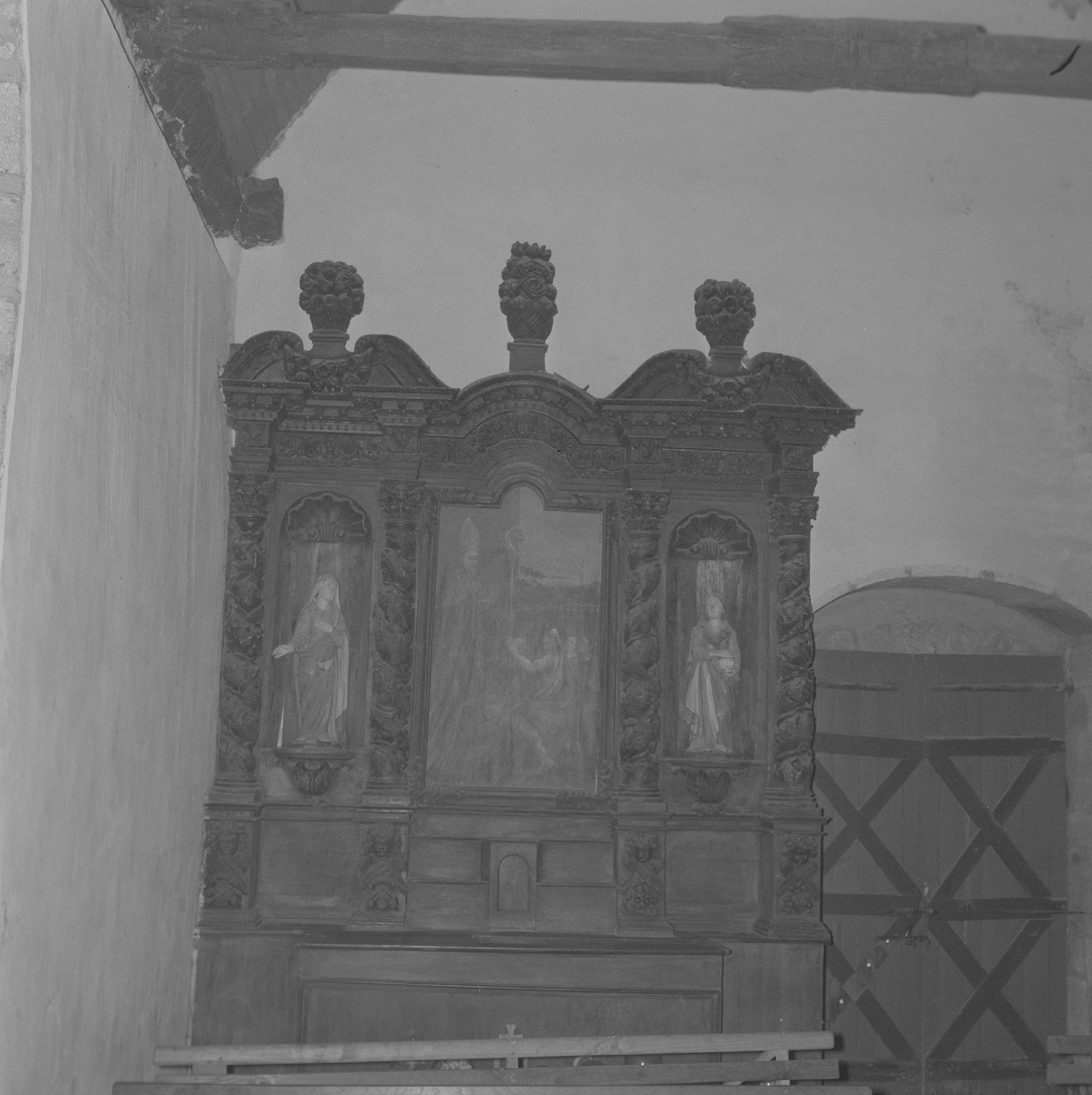 Le retable se compose de trois travées : la partie centrale comportant un tableau est flanquée de deux niches, cantonnées de colonnes torses à chapiteaux corinthiens enroulées de pampre. Les niches, ornées de coquilles, abritent les statues de sainte Madeleine et d'une Vierge du Calvaire. Au-dessus de ces niches, des frontons brisés. Trois bouquets de fleurs couronnent l'ensemble. Au registre inférieur se trouvent, au bas de chaque colonne, des têtes d'anges.