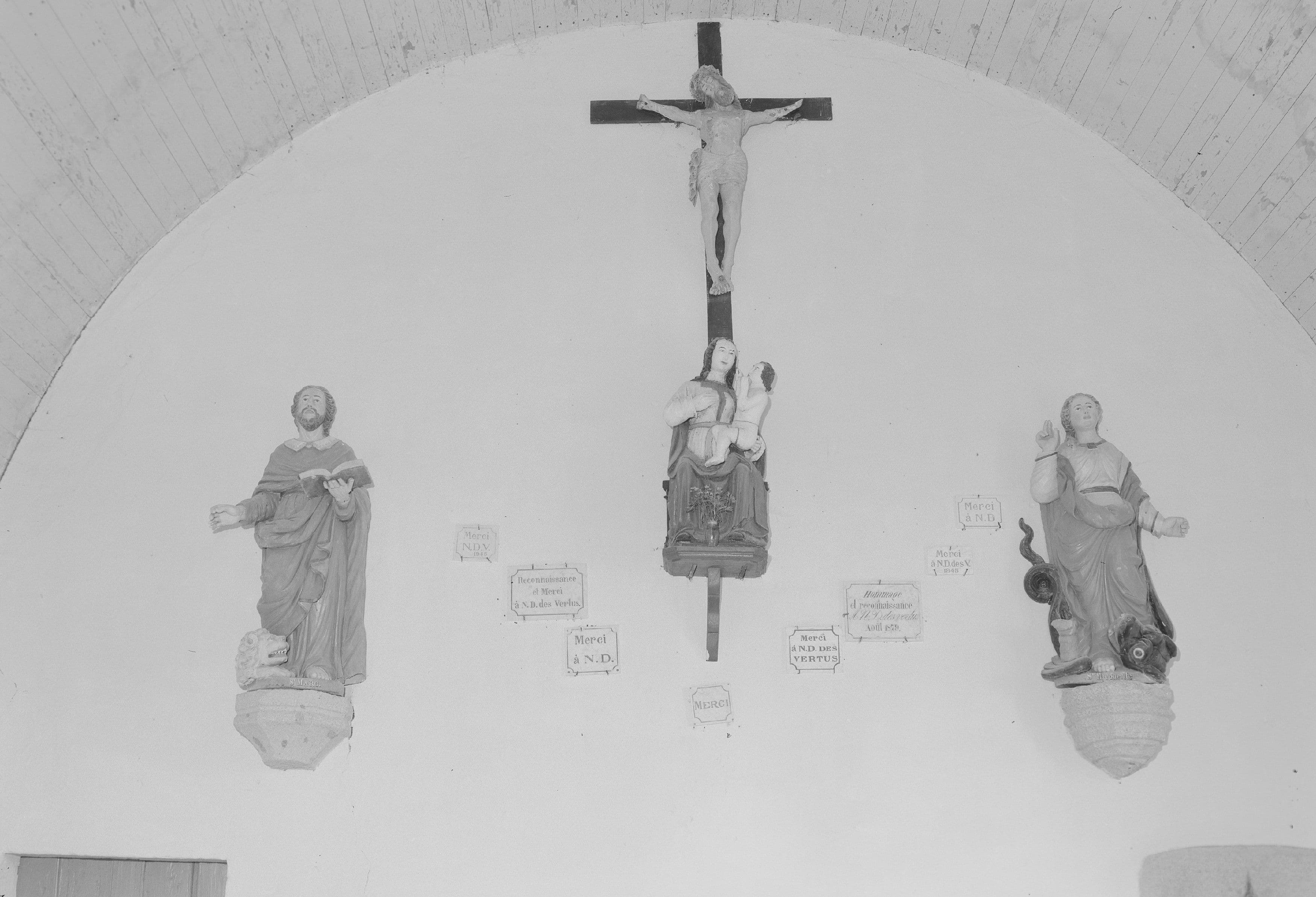 Ces quatre statues sont adossées au mur. Elles ne forment pas un ensemble. Le Christ en croix est accroché en hauteur au centre. La Vierge à l'Enfant se trouve juste en-dessous, tandis que la statue de saint Marc se trouve à gauche et celle de sainte Marguerite à droite.