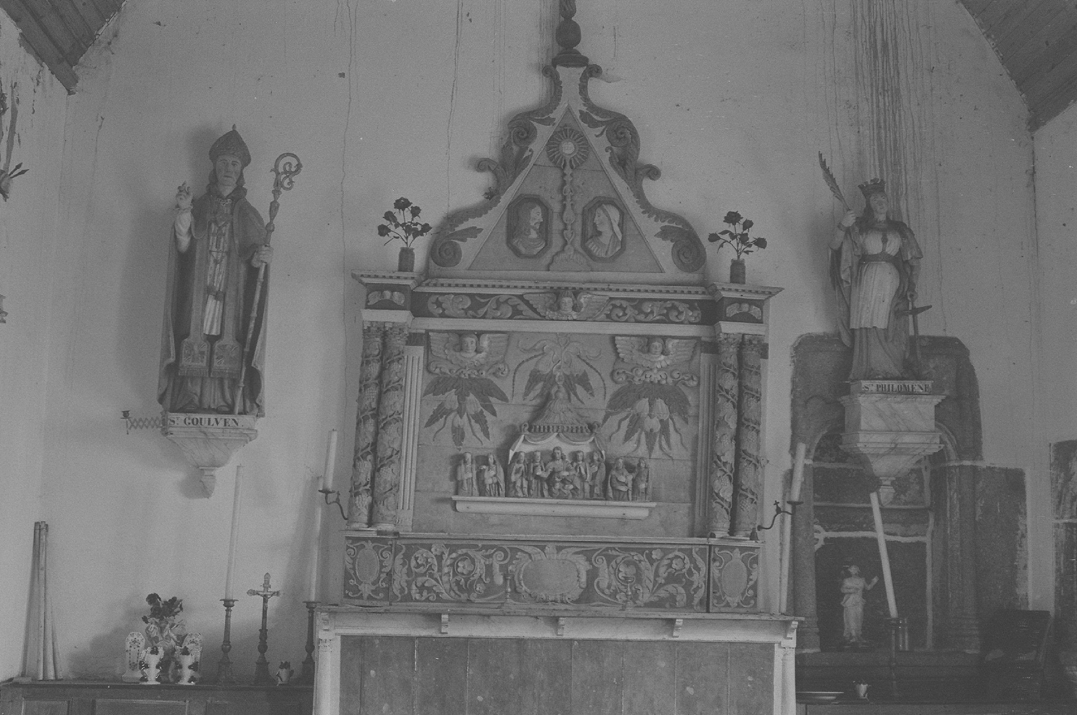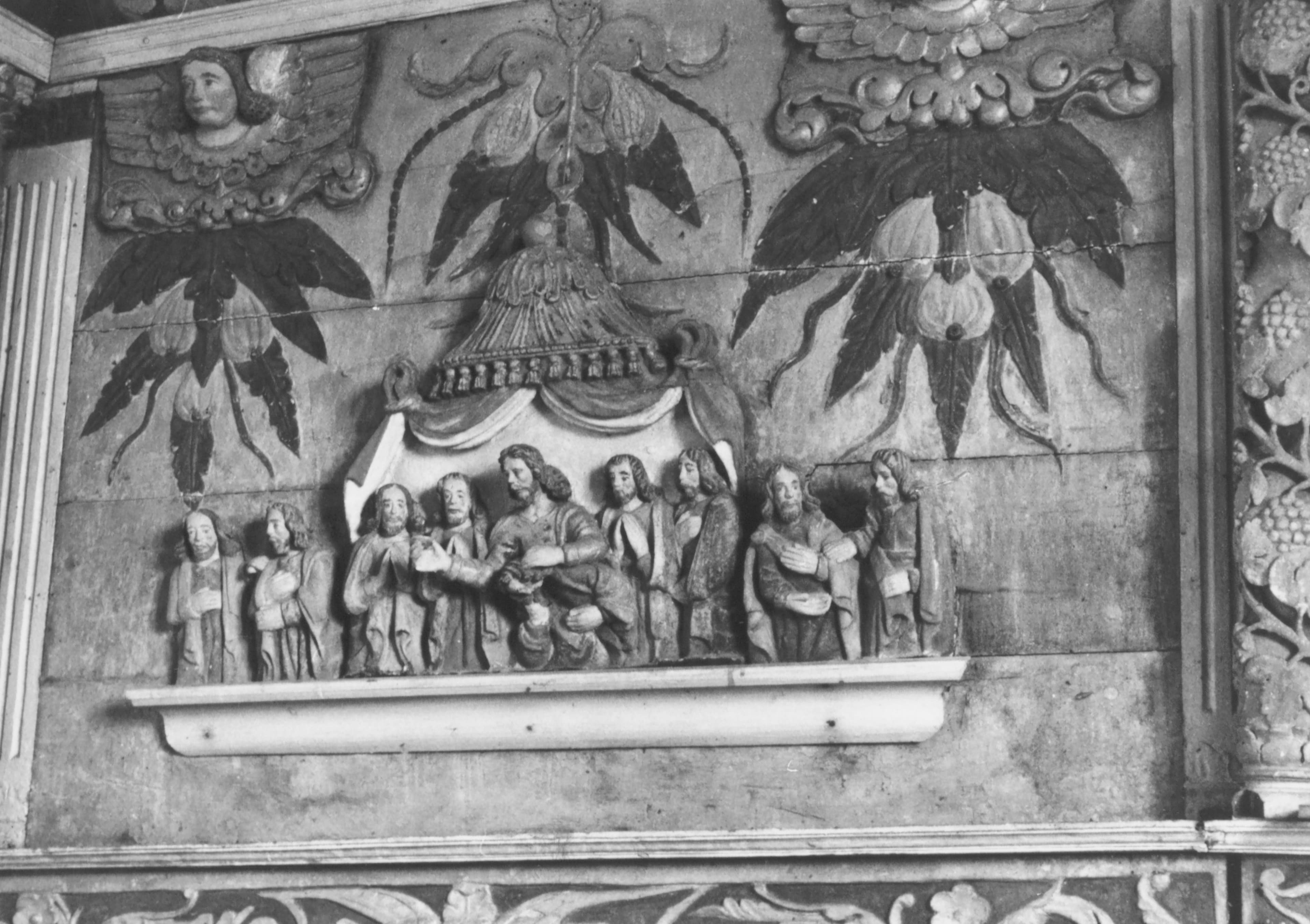 Cène : tente ; angelot : tête ; portrait : de profil, en médaillon ; pampre ; rinceau ; pot à fleur ; ostensoir