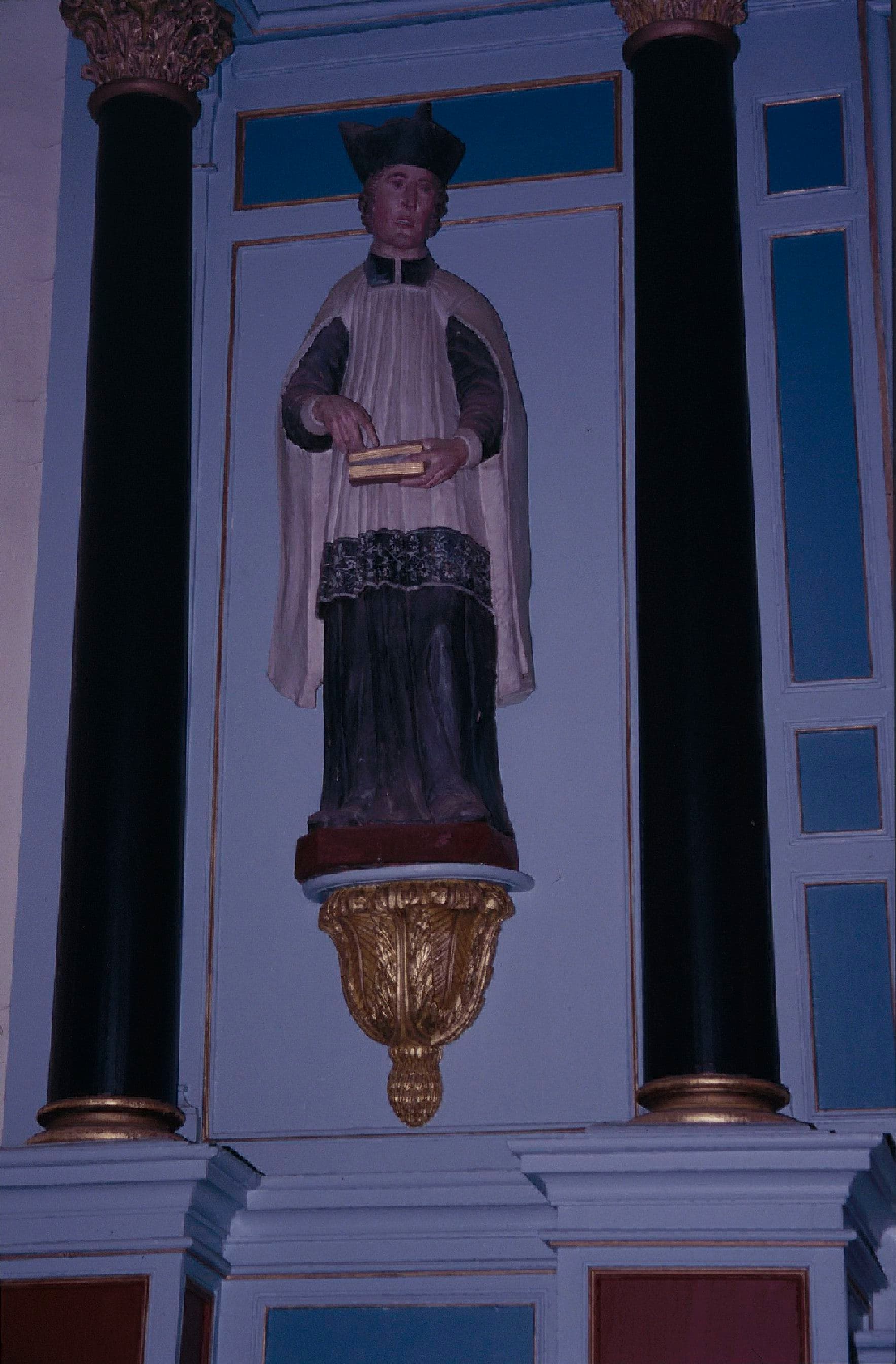 Le saint, vêtu du surplis et portant la barrette, semble effectuer une plaidoirie. Il désigne de l'index droit le livre entrouvert qu'il tient.