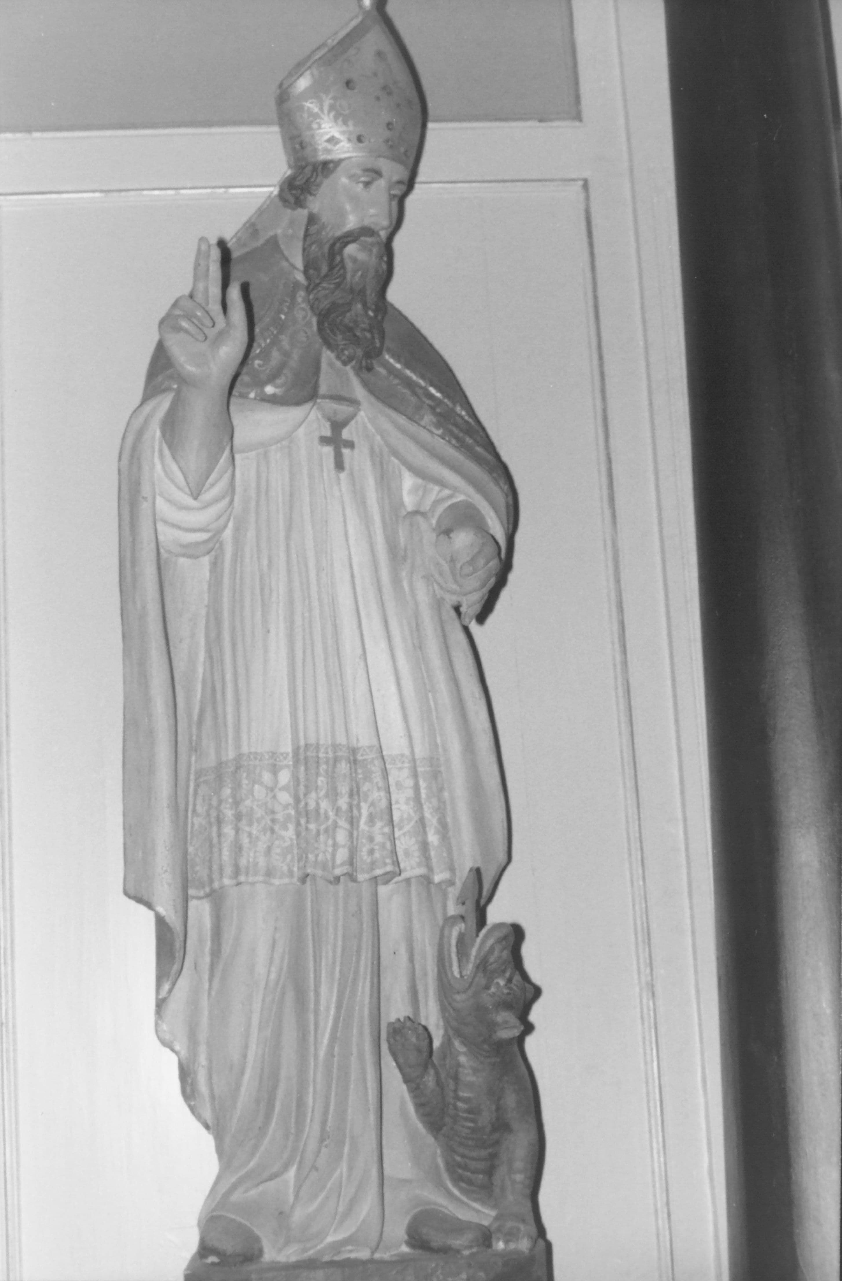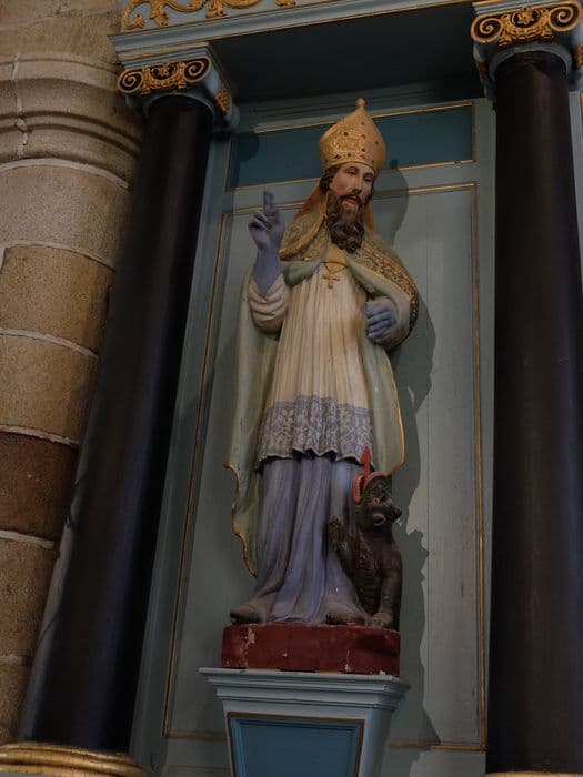 Le saint évêque, portant la mitre et la chasuble, bénit de la main droite. A ses pieds se dresse un animal à la langue pointue, peut-être un loup. Ce dernier élément permettrait peut-être d'identifier cette statue comme celle d'un saint Loup, comme le suggère sans certitude l'arrêté.