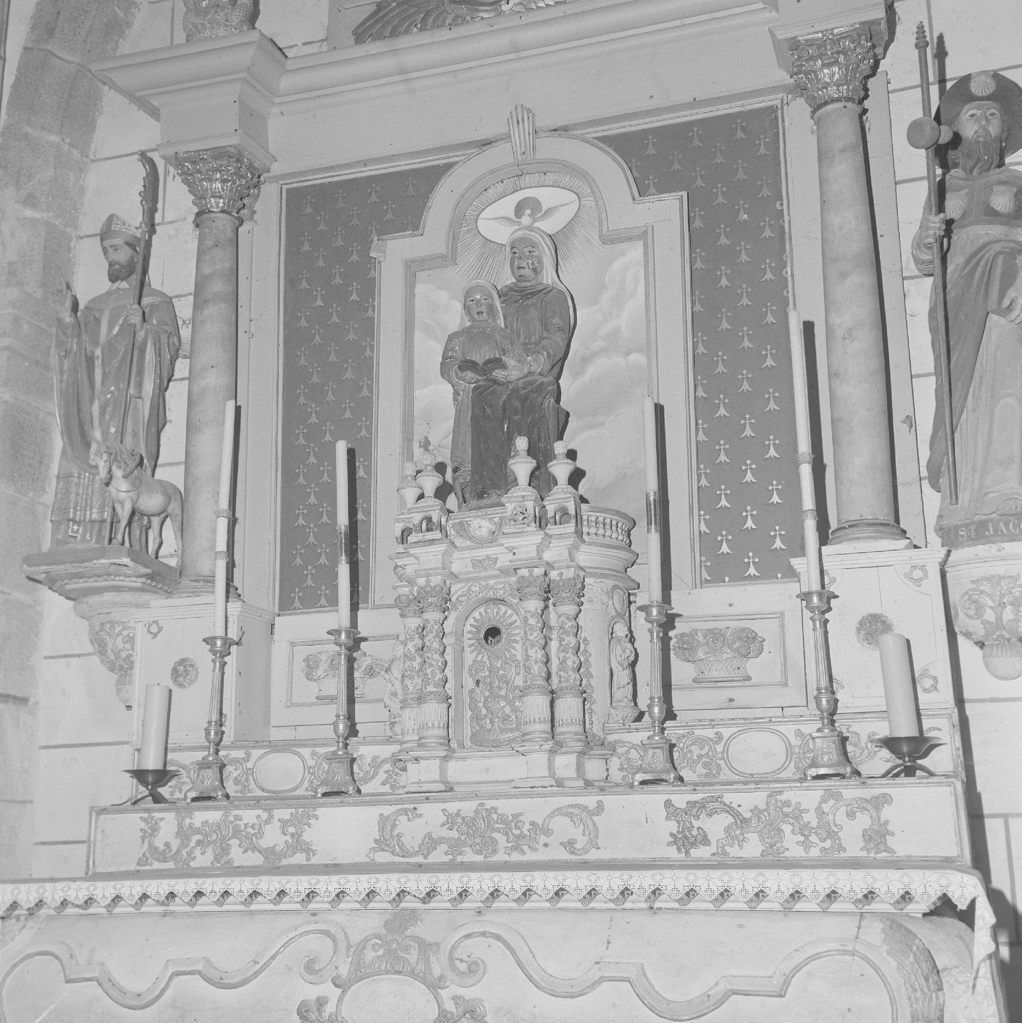 sainte Anne ; coquille ; cartouche ; guirlande ; angelot ; rinceau ; rose ; pot à fleur ; ordre composite ; bouquet ; volute ; Dieu le Père : en buste, nuée, globe ; colonne torse ; ciboire