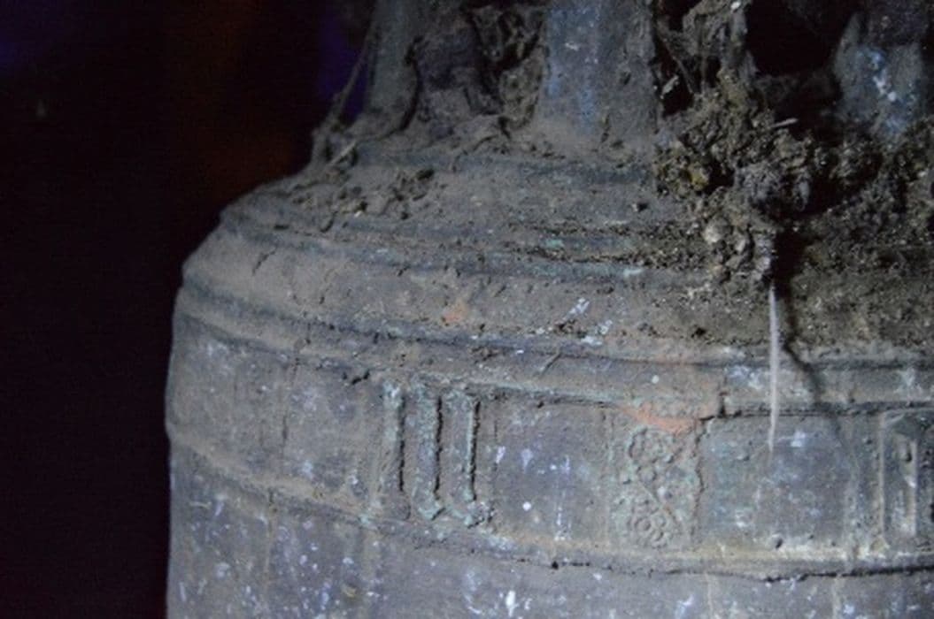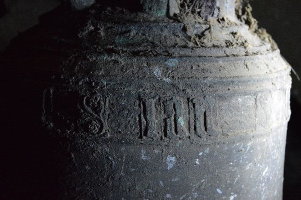 Cloche portant inscription en caractères gothiques sur une seule ligne, dans un bandeau encadré de filets.
