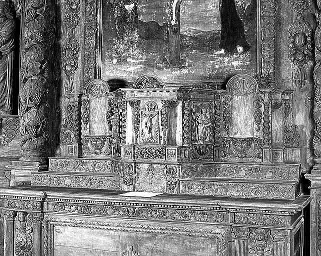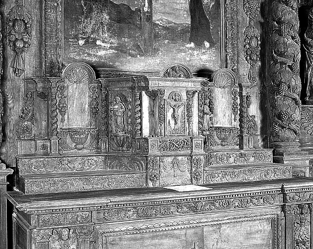 ornementation (à chute, à fleur, à feuille d'acanthe, à quintefeuille, à denticules, à colonne torse, à pampre, à chapiteau corinthien, à godron, à canal, à coquille, à draperie, à fruit) ; Christ en croix ; saint Esprit ; Dieu le Père ; saint Jean-Baptiste ; saint Pierre ; saint Paul ; apôtre ; putto