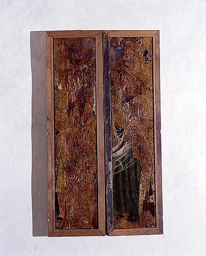 Les deux volets de polyptyque sont de forme rectangulaire verticale. Les panneaux sont peints sur les deux faces et sont encastrés dans un cadre-châssis en chêne moderne (sauf un montant d'origine).