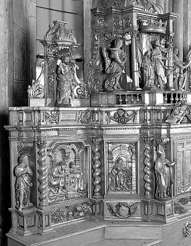ornementation (à rinceau, à guirlande, à fruit, à colonne torse, à chapiteau corinthien, à fleur, à denticules, à chute, à feuille d'acanthe, à draperie) ; angelot ; ange ; Annonciation ; Nativité ; Adoration des Mages ; la croix ; saint Jean-Baptiste ; saint Paul ; saint (évêque) ; saint Pierre ; saint Jérôme ; cariatide