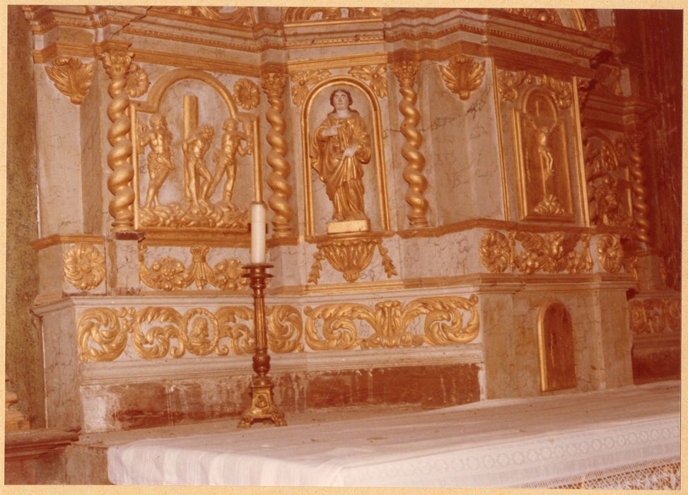 L'antependium déposé est en très mauvais état. Restauration de l'autel et du tabernacle par les Etablissements Jean Férignac (Hautefort) en 1990-1992. Un gradin ainsi qu'une petite armoire de tabernacle ont été refaits immédiatement au-dessus de l'autel, remplaçant des éléments disparus.