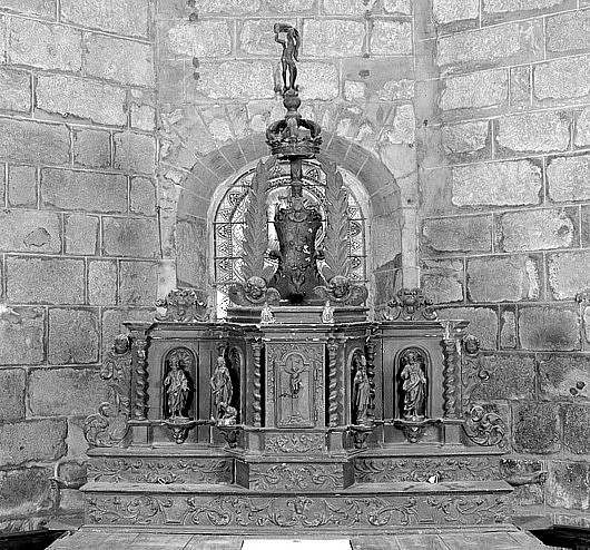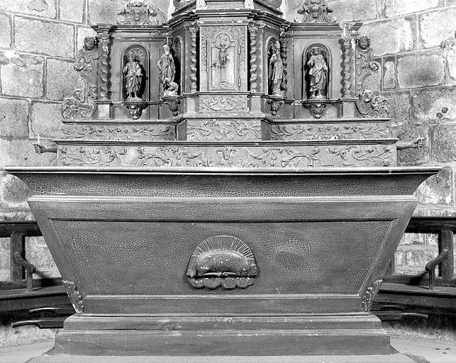 Les gradins sont décorés de rinceaux composés de volutes, fleurons, fleurs et feuilles. Deux bras avec main serrée reçoivent les bougies sur les côtés. Le soubassement de l'armoire présente lui aussi des rinceaux, sur les côté il reçoit les culots des niches. La porte de l'armoire est sculptée du Christ en croix. Les colonnettes torses portent, sur leurs chapiteaux corinthiens, un entablement mouluré. Les niches à coquille abritent les statuettes de divers saints, de gauche à droite : saint non identifié (chauve, très longue barbe, mains cassées) ; saint Jean-Baptiste (agneau à droite, longue chevelure, torse à demi-nu) ; saint évêque (bénissant, il manque la crosse) ; second saint non identifié (chauve et barbu, il manque les mains). Les petits frontons des ailes sont sculptés en cartouche ; les ailerons sont timbrés d'un angelot et agrafés de feuilles d'acanthe. Deux longues palmes portent la couronne du dais de l'exposition à l'avant ; deux angelots leur servent de base. La statuette du Christ ressuscité surmonte l'ensemble.