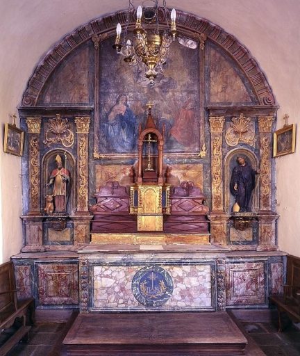 Autel tombeau. Retable à trois travées rythmées par des pilastres corinthiens, cintré en partie supérieure. Dans les travées latérales, niches contenant une statue. Dans la travée centrale grand tableau d'autel. Au centre de la corniche cintrée du couronnement, un médaillon peint.