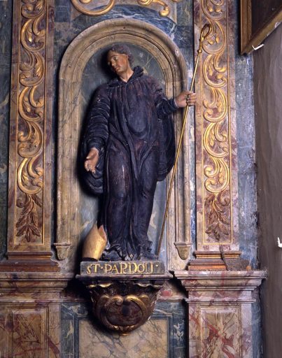 saint Blaise (évêque, crosse, boeuf) ; saint Pardoux (moine, crosse, mitre) ; Ascension ; Christ en croix ; IHS ; pilastre, chapiteau corinthien, coquille, ornement rocaille