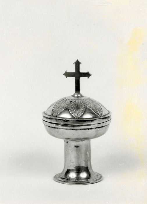 Ciboire des malades en argent dont l'intérieur de la coupe pourrait être doré. La coupe est placée au sommet d'un pied cylindrique évasé à sa base. Elle est fermée par un couvercle travaillé au repoussé et ciselé, il est doté d'un élément de préhension à son sommet.