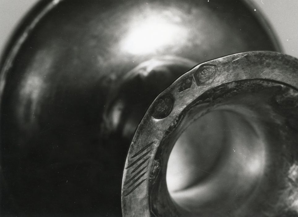 Les trois poinçons sont insculpés au revers de la bâte du pied. 1er titre département : tête de tête de vieille femme chiffre 1. Grosse garantie départements : tête d'Hercule, différent 82 (Haute-Vienne). Poinçon de maître : losange vertical, lettre L sous un coeur.