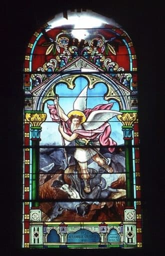3 verrières : saint Michel terrassant le démon et 2 verrières décoratives
