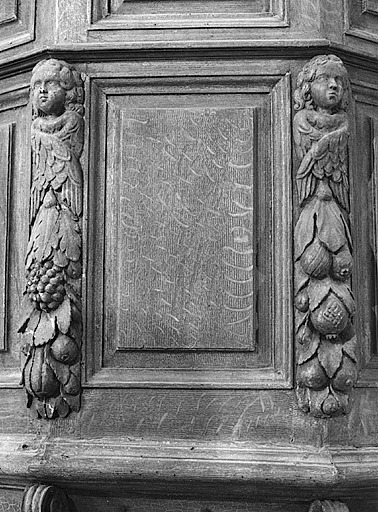 Eléments sculptés du 17e siècle sur une chaire à prêcher du 19e siècle (?).