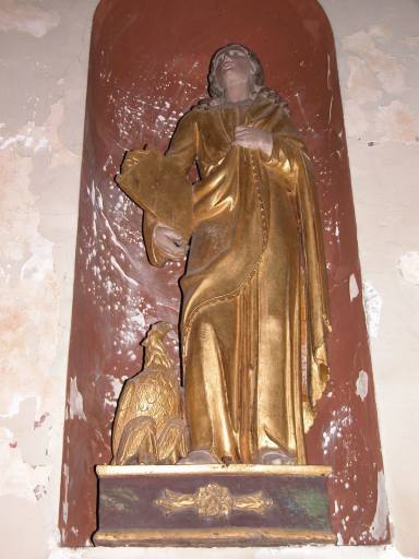 Statues empoussiérées. Quelques lacunes de dorure. La tête de l'aigle de saint Jean est rongée par une vermoulure active.