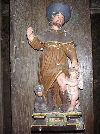 Ecaillages de la polychromie. Il manque le pouce droit de saint Roch et son bâton de pèlerin a disparu.