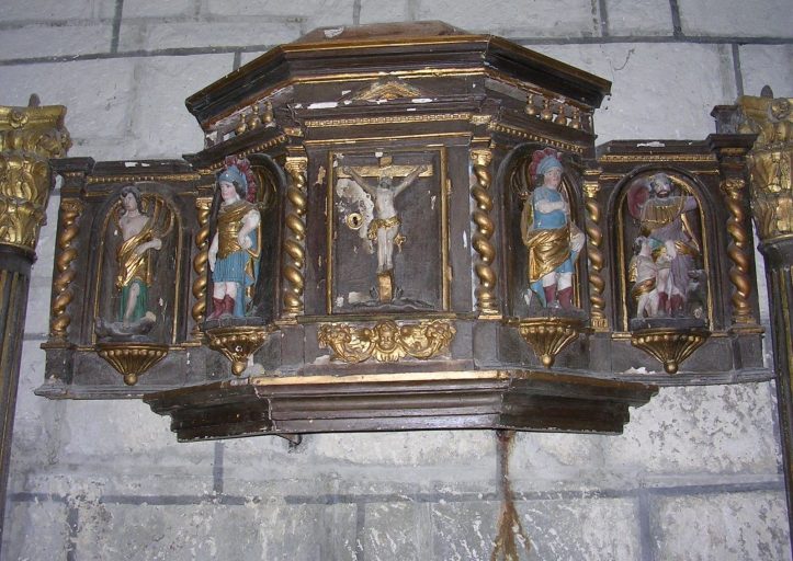 Christ en croix en bas-relief sur la porte de l'armoire, soulignée par une tête d'angelot. Deux statuettes de saints légionnaires dans les niches des pans coupés de l'armoire : sans doute saint Abdon et saint Sennen. Statuette de saint Roch avec l'ange et le chien dans la niche de l'aile droite ; statuette de saint Michel terrassant le démon dans la niche de l'aile gauche.