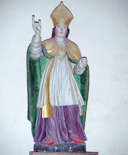 Saint évêque bénissant de la main droite, et tenant une crosse (disparue) de la main gauche.