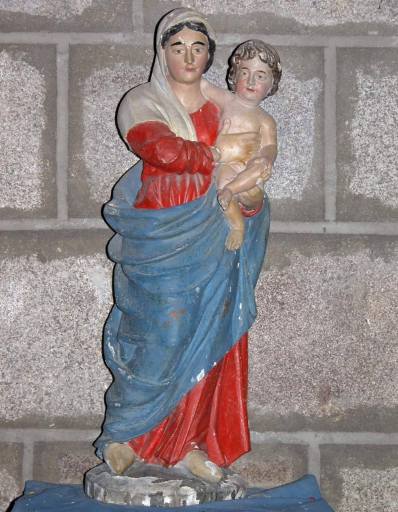 Repeint moderne, traces de dorure sous le manteau de la Vierge. Ecaillage de la polychromie, notamment en partie basse.
