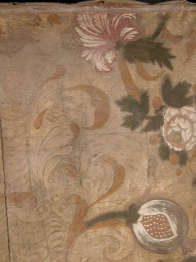 Cloué par des semences en fer sur un châssis de bois. Déformations, déchirure, un fragment détaché (coeur de la fleur). Dorure et polychromie passées, salies, empoussiérées ; les tons originels sont visibles sur les lisières. Carreaux centraux recousus à la machine. Restauration par Michel Huet prévue en 2008.